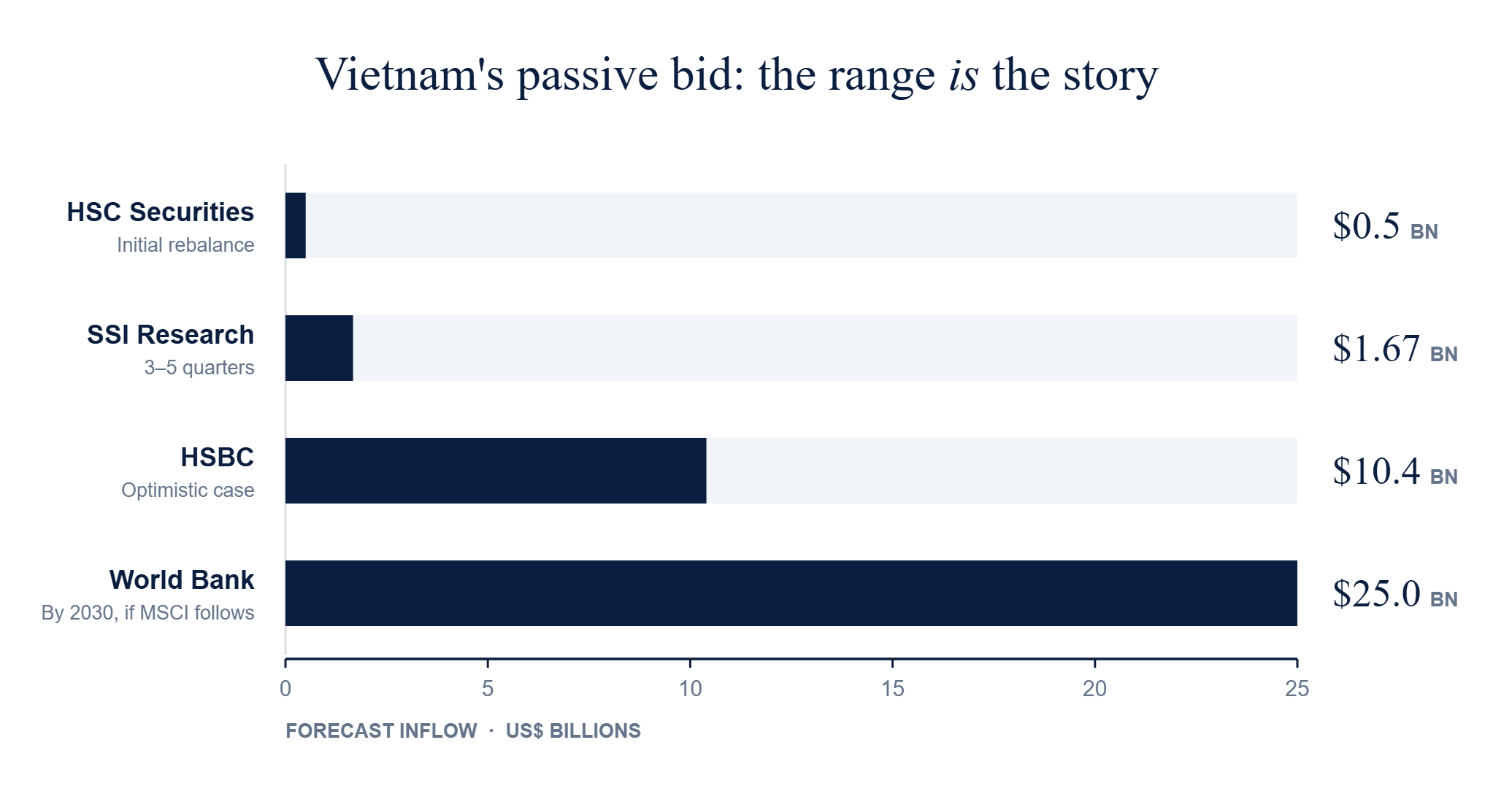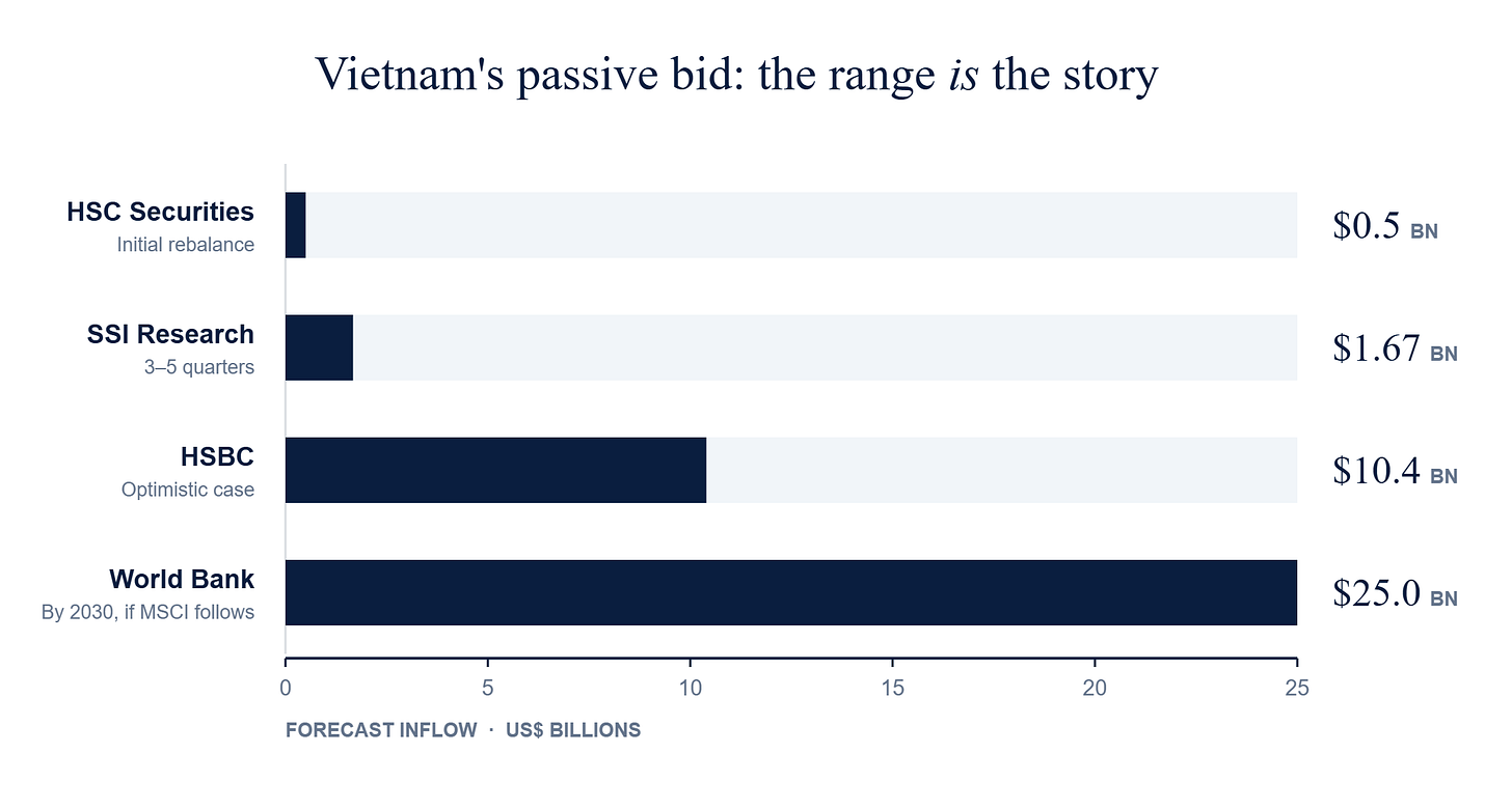 Now, how much passive money that actually drags into Vietnam is where the sell-side disagrees. Estimates of inflow over the twelve months following the effective date range from US$1.7 billion (SSI Research) to US$10.4 billion (HSBC). In addition, to The World Bank projects cumulative inflows of US$25 billion by 2030 if MSCI follows with a second upgrade.