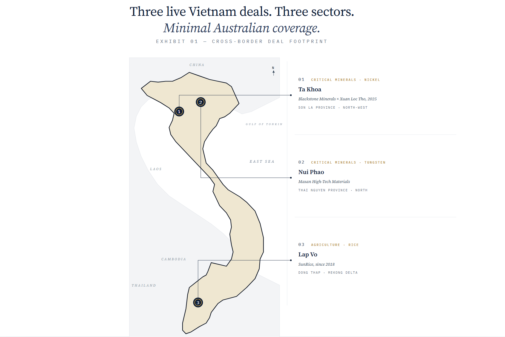 Nickel. Tungsten. Rice. Three sectors, three live deals, three counterparties most Australian investors could not name from memory. The 2025 AusCham survey found 61% of Australian businesses in Southeast Asia rank Vietnam as their top expansion market with the highest share in ASEAN.